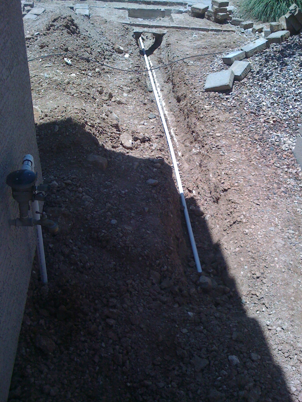 First picture (Way large view) is pavers sitting directly above an auto fill line. Notice the efflorescence? The white chalky material on the pavers. This is a sign that there is or has been water under the pavers, couple that with the lines (annotations) I added to show the direction of the auto fill line and what do you have? You have a possible leak in the auto fill line. If it were a big leak you might have standing water around the patio but a small leak may never present itself like that, instead you may find dampness or maybe even efflorescence! The second picture is an exposed plumbing trench from another pool. Here is the same area before it was dug up.