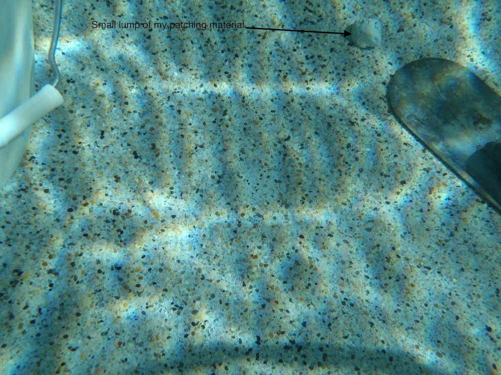After I removed the foreign material from this, and the other spot, I mix my patch to blend in with the color of the pools surface. Although this is an Aqua Blue colored finish I can’t just whip up a patch with Aqua Blue dye, it wouldn’t match. I played around with this patch for almost an hour trying to customize the color to match.