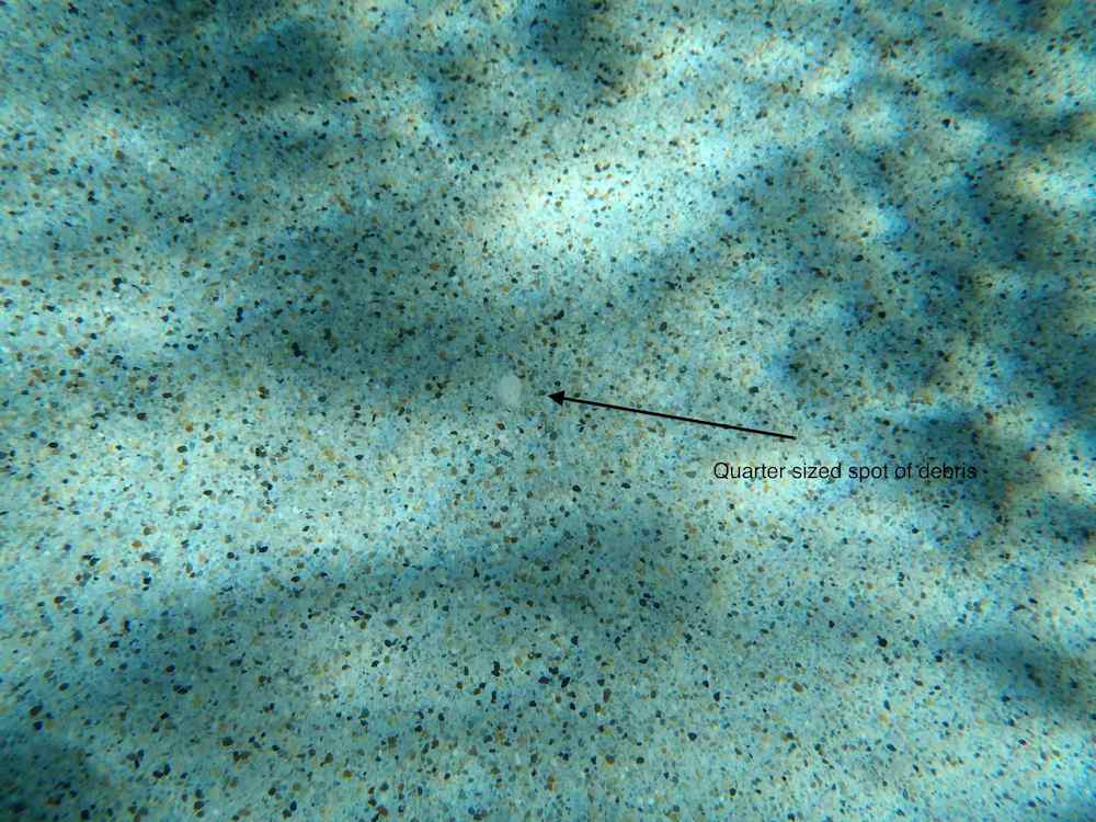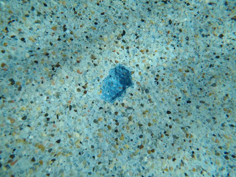 Here is a pebbled pool that had some debris embedded in the finish. This is a common problem, whether it’s organic impurities (seeds, flower pods, leaves and even dead bugs), or trash from the pebble crew (Yuck), it can drive pool owners crazy. I am surprised sometimes at just what can be seen by the pool owner (I often wonder if they are in the pool with a magnifying glass looking over every square inch of the surface) and by what I find embedded into the finish (yuck). This pool had two such spots, both were construction material. I only took pictures of this one.