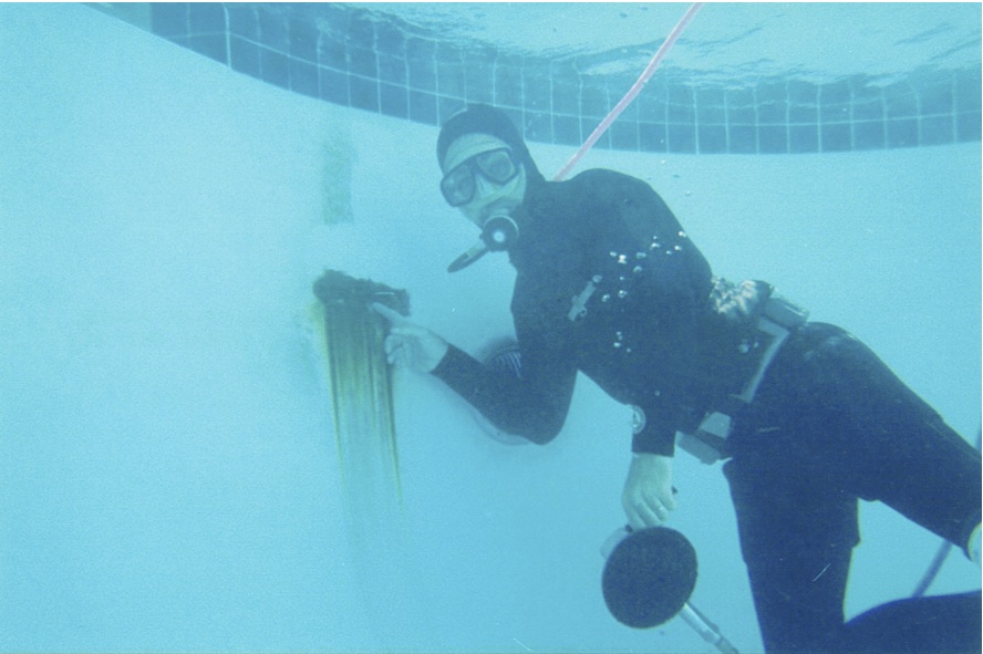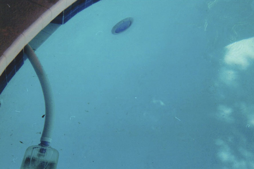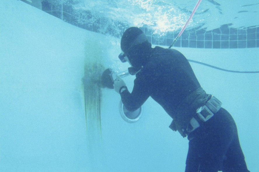 This has to be one of the ugliest rebar rust stains I have ever seen in a pool, in fact there are three stains in this pool as you can see in the first picture. One on the wall, and two previously partially repaired, directly below on the floor. All had been worked on before by someone else. It looks to me like they didn’t finish the repair! The big one on the wall was left open, you can see the exposed rebar and hole in the second picture. The first thing I wanted to do when I got into the pool was see if I could remove all the residual rust trailing down the wall, sometimes this is almost impossible and is an important reason to have these rust stains repaired quickly, correctly and completely. Next I dug out and cut out all the rusted rebar, plaster and shotcrete from these infected areas, I then patched with my cosmetically compatible patching material. The final picture was taken the next day from a better angle. The light and skimmer in both pictures with give you a point of reference on where the patch is, can you see it?