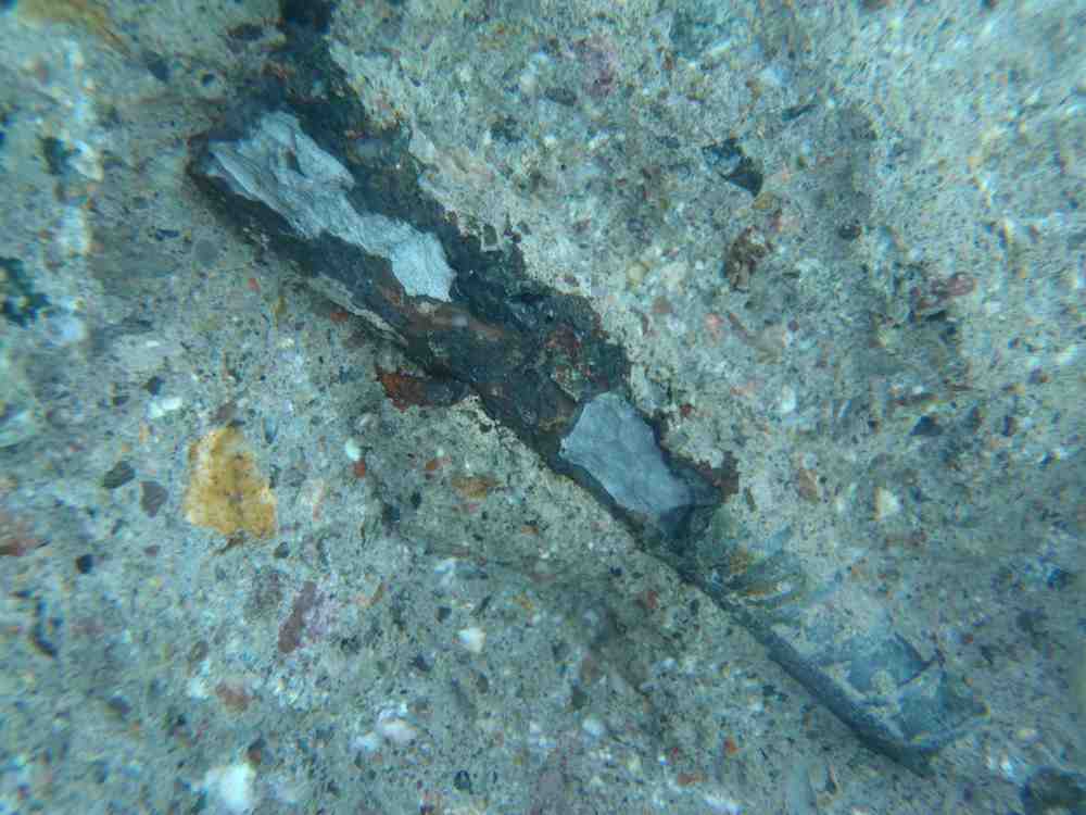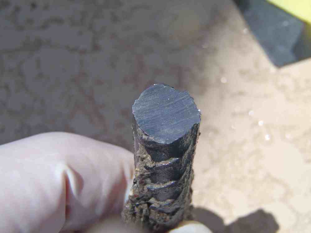 Here is a golf ball sized rebar rust stain on the bench back of this Ultra-Poz Sapphire finished pool. These can be a bit more difficult to repair than rebar rust stains on the floor or wall of a pool. Most of these involve patching flat and curved surfaces at the same time. I got a little bit lucky on this one as it didn’t roll too far into the seat area, but I still had a inside curve to deal with. Inside and outside rounded edge repair on Ultra-Poz, 3M Quartz or Pebble are tricky at best. Photos one through six are start to finish of the repair. In the second picture you will notice intense rust on one end of the rebar and clean non-rusted steel on the bottom right edge of this picture. This was what I call a dead end rebar, only one end is connected to more rebar, the other end should have had an overlapping piece tied over it. The third picture shows the cut and removed rebar to the side of the repair area. The forth picture is where I cut the rebar clean and flush with the shotcrete, the shiny silver spot in the center is the cut rebar, notice there is no visible rust on the cut end of the embedded rebar or the removed piece in the fifth picture. I always inspect the bottom of the removed piece of steel to ensure I removed all of the rusted rebar, if it is rusted on the bottom I continue exposing and cutting until I find clean steel. It is the only way to ensure that it wont come back, after all, I guarantee my work. The final picture is the finished patch.