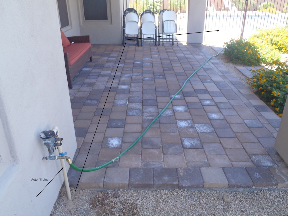 First picture (Way large view) is pavers sitting directly above an auto fill line. Notice the efflorescence? The white chalky material on the pavers. This is a sign that there is or has been water under the pavers, couple that with the lines (annotations) I added to show the direction of the auto fill line and what do you have? You have a possible leak in the auto fill line. If it were a big leak you might have standing water around the patio but a small leak may never present itself like that, instead you may find dampness or maybe even efflorescence! The second picture is an exposed plumbing trench from another pool. Here is the same area before it was dug up.