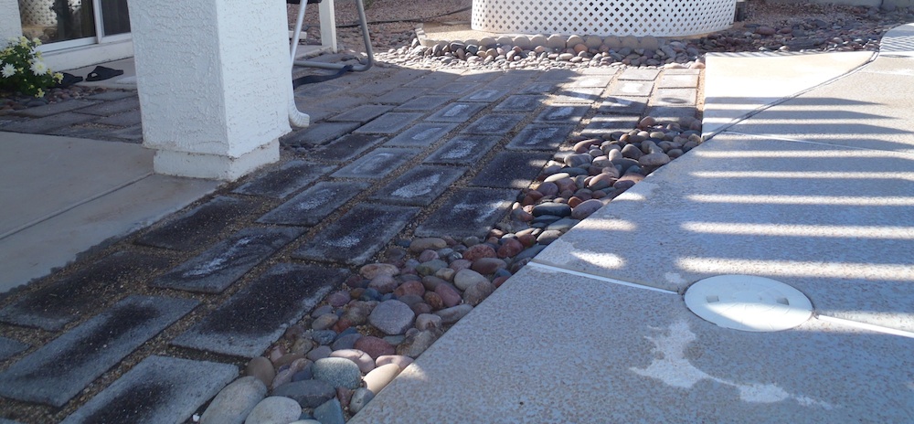 Beside the little bit of water I left behind on the cool deck, after completing the repair, you can see the saturated soil and water stained concrete pavers. The soil was saturated all the way to the slab of the house. I believe this water may have been causing the deck to lift and move around as this house was in a highly expansive soil area.